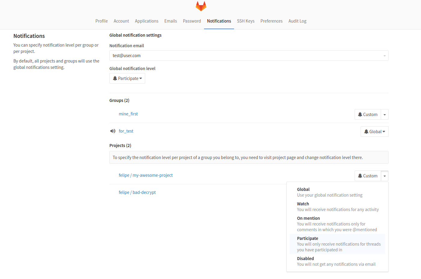 Group Settings are taking precedence over Global Settings but are on a level below Project Settings. This means that you can set a different level of notifications per group while still being able to have a finer level setting per project. Organization like this is suitable for users that belong to different groups but don't have the same need for being notified for every group they are member of. These settings can be configured on group page under the name of the group. It will be the dropdown with the bell icon. They can also be configured on the user profile notifications dropdown.